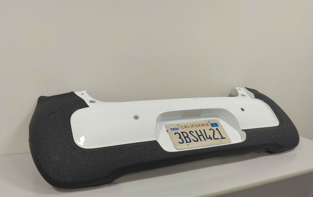 こちらの製品は自動車のリアバンパーです。こちらはタフな外観、キズ防止、耐久度向上を目的とした試作品になります。