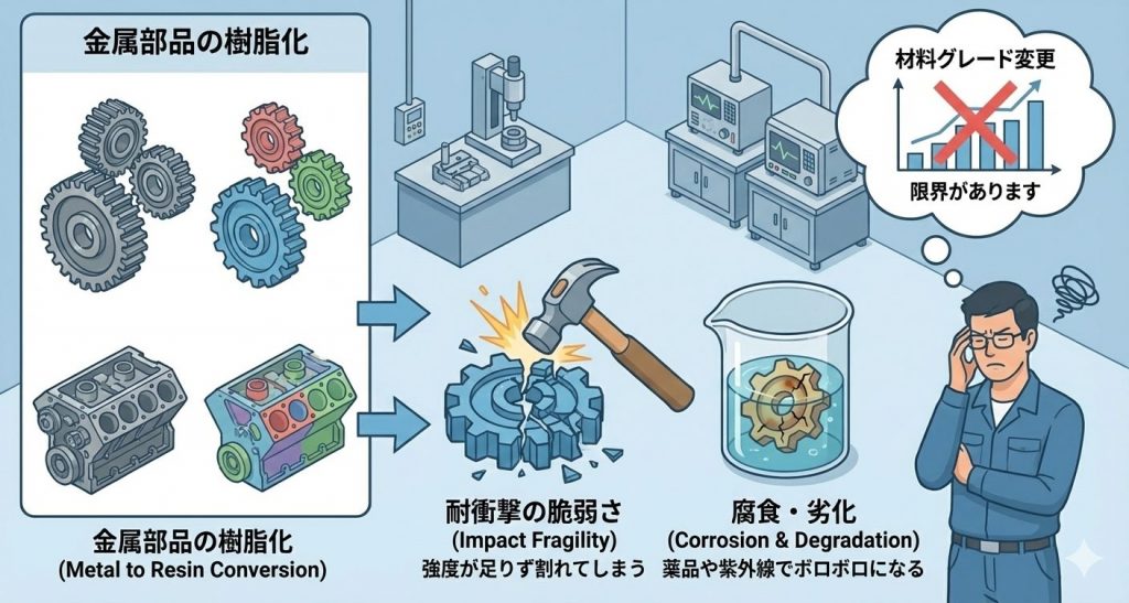しかし、プラスチック特有の「耐衝撃の脆弱さ」と過酷な環境下での「腐食・劣化」は、金属からの置き換えを検討する上でネックとなり、「強度が足りず割れてしまう」「薬品や紫外線でボロボロになる」といった課題に対し、材料のグレード変更だけで対応するには限界があります。